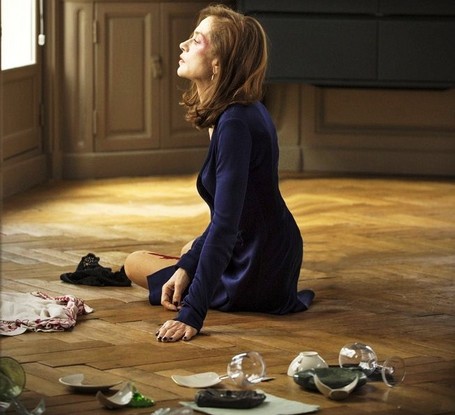 Huppert est Michèle, dirigeante – regina imperatrix – d'une société de création de jeux vidéo qui a tout réussi, même son divorce… Belle maison de meulière dans la chic banlieue ouest de Paris, fils bordélique mais aimant, meilleure amie qui est aussi son associée, ex-mari largué mais resté complice. Rien ne semble pouvoir obscurcir sa vie de femme épanouie et indépendante. Jusqu'au jour où, brisant le calme paisible de sa demeure, surgit un agresseur masqué, et la brutalité du viol est d'autant plus terrifiante qu'elle surprend totalement : et pour cause, c'est la scène d'ouverture !