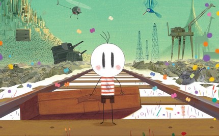 Le dessin est limpide, minimaliste et pourtant puissamment expressif. Le petit garçon du titre a des bras et des jambes fins comme du fil à coudre, une tête ronde comme un ballon, deux traits verticaux pour les yeux, trois cheveux dressés sur son crâne et il porte une marinière rayée rouge et blanc. Un jour son père n'est plus là, parti pour on ne sait où. Alors le gamin quitte la ferme familiale et se lance à sa recherche. Et tout de suite la magie opère parce qu'à travers les yeux de l'enfant qui découvre le monde, tour à tour merveilleux puis terrifiant, les éléments ne sont qu'un tourbillon de couleurs qui parfois virent au sombre.